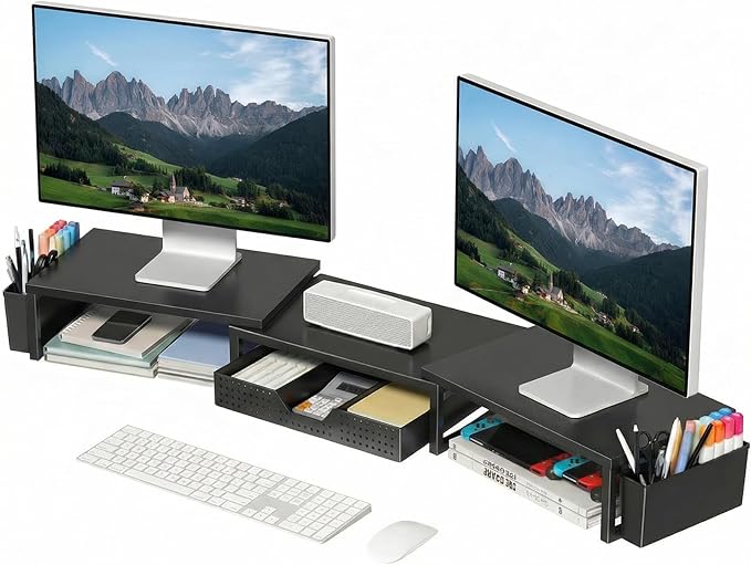 • 【Ergonomic Eye-Level Comfort】Say goodbye to neck pain. Easily raise your monitor or laptop to the perfect height with our ergonomic dual monitor stand. This ideal positioning reduces strain, improves posture, and keeps you comfortable all day long—whether it's work, study, or gaming