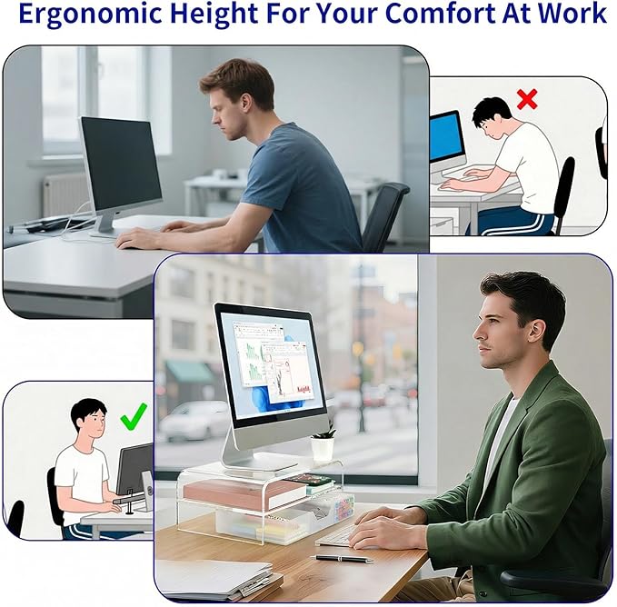 • 【Durable and Stable】:The crystal-clear acrylic computer stand is made of high quality material with sturdy construction, it can easily carry the weight of the display and computer accessories, to ensure stable and non-shaking for a long time, ideal for use in the office, dorm room or home